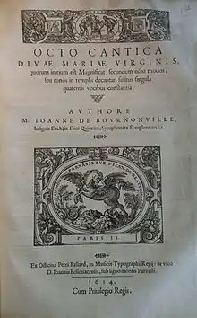 The same collection indicates him at that time as master of the children of the collegiate church of Saint-Quentin.[2] In 1613 Bournonville offered to the chapter of the Cambrai Cathedral a bound collection of his masses (probably the Parisian editions of Pierre I Ballard).[3] He remained in Saint-Quentin until about 1618.[4]
