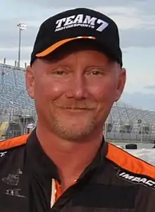 In 2011 at age 45, he made his NASCAR debut, competing in three events in NASCAR Camping World Truck Series.[4] He then competed in 11 events in the 2012 season and 15 races in 2013, including a combined effort between Team 7 Motorsports and Hillman Racing.[5] He ended his NASCAR career with 29 starts.[6] His best finish was 14th at Martinsville Speedway in 2011.
