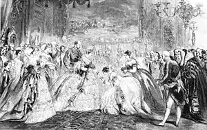 The Queen Charlotte's Ball is named after Charlotte of Mecklenburg-Strelitz. The first ball was hosted in 1780 by Charlotte's husband, King George III, in honour of her birthday.[1][2] The Queen stood next to a giant birthday cake and debutantes curtseyed to her.[3] Charlotte of Mecklenburg-Strelitz funded a London women's hospital, later named the Queen Charlotte's and Chelsea Hospital, with funds raised from the ball.[2][4] The ball, which continued to take place annually in celebration of the queen's birthday, became the premier debutante ball of the London Season.[5]