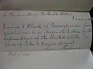 On February 5, 1861, President Buchanan nominated him for a seat on the Supreme Court of the United States; but a February 21 motion to proceed to consider the nomination was defeated 25–26, and it lapsed at the end of the 36th Congress.[3] Subsequently, Black was named Reporter of Decisions of the Supreme Court of the United States, a position he held for two years. After publishing the reports for 1861 and 1862 (U.S. 66–67), he resigned and devoted himself almost exclusively to his private law practice.[2]