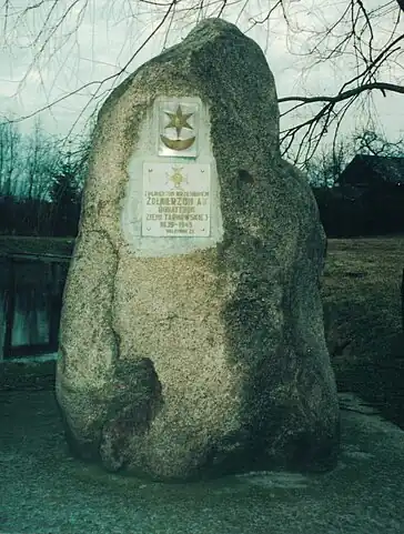 In 1989-1990 a monument was erected in the memory of area soldiers who served and died in WWII. It was established by Stanisław Zając, who placed it at the edge of his land, by the road leading into the village center. It was dedicated and blessed in the fall of 1991. The memorial is made of up a single, large rock, with a plaque of the Tarnów coat of arms followed by the following: