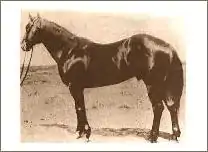 Joe Hancock was registered as number 455 in the American Quarter Horse Association (or AQHA).[1] He was foaled most probably in 1926, although the dates are somewhat hazy.[2] He was a brown stallion, registered as bred by an unknown breeder, but later research determined that his breeder was John Jackson Hancock.[1][2] His sire was a son of Peter McCue named John Wilkens and his dam was a half Percheron mare, although the AQHA's stud book gives his dam as "unknown."[1][2][3] John Wilkens was inbred to the Thoroughbred stallion Voltigeur, as well as being a descendant of the Thoroughbred Glencoe.[4] When he was registered, he was owned by the Tom L. Burnett Estate in Fort Worth, Texas, which later became the 6666 Ranch.[5]