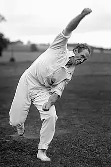 A skilled batsman who proved his worth as a bowler, King set numerous records in the continent of North America during his career and led the first-class bowling averages in England in 1908.[1] He successfully competed against the best cricketers from England and Australia. King was the dominant bowler on his team when it toured England in 1897, 1903, and 1908. He dismissed batsmen with his unique delivery, which he called the "angler", and helped develop the art of swing bowling in the sport.[2] Sir Pelham Warner described Bart King as "one of the finest bowlers of all time",[3] and Donald Bradman called him "America's greatest cricketing son."[4]