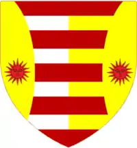 Gules four Bars per pale Argent and Or two Flaunches of the third each charged with a Sun of the field