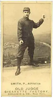 Smith began his professional baseball career at age 18 playing for the Baltimore club in the National Association in 1883.[2] In 1884, he played one game as pitcher for the Philadelphia Athletics and another for the Pittsburgh Alleghenys. He compiled an 0–2 win–loss record and a 6.35 earned run average (ERA) in his first season in the major leagues.[1]