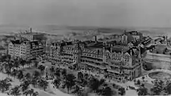 Ellen G. White, who had proclaimed that a cleansing sword of fire was poised over the increasingly "worldly" and business-oriented Battle Creek, was against rebuilding the large institution.[29][30] Although she apparently wrote a manuscript testifying against the rebuilding in 1902, it was not sent to Kellogg at that time,[29] and Kellogg did not directly consult her about his plans.[23]:38 With support of the board of directors, he not only rebuilt the institution, but doubled its size. The new building was designed by architect Frank Mills Andrews of Ohio[31] and opened on May 31, 1903.[15]:xiii–xv[26]:189 Designed to be fireproof, the new brick building was six stories high, with an elegant frontage extending 550 feet along Washington Avenue, and three wings opening out behind. It included, among other things, a solarium and palm court, and it cost more than $700,000.[32]