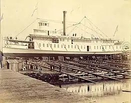 Leary built the steamer Bailey Gatzert for SSN&T.[92] One of the finest steamers of her time,[92][93] it was named after Leary's friend and close business associate Bailey Gatzert, and cost between $100,000 ($2,600,000[note 2])[94] and $125,000 ($3,300,000[note 2]).[92]