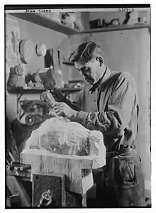 One of Clarke's sculptures was owned by Warren G. Harding and was displayed in the White House.[7] In 1924, John D. Rockefeller purchased 4 of Clarke's sculptures. In 1940, Clarke was commissioned to create a pair of relief panels. When they were completed they each weighed more than a ton, today the two panels adorn the Blackfeet Hospital lobby.[7] His work is in the collection at the Montana Historical Society.[5]