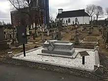 After an elaborate funeral was staged for him in the United Kingdom by Queen Victoria, Thompson's remains were transported back to Canada aboard the armoured cruiser HMS Blenheim, which was painted black for the occasion. He was buried on January 3, 1895, in the Holy Cross Cemetery in Halifax, Nova Scotia.[4][8]