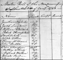 Jonathan enlisted in the American Revolutionary War in spring 1777 at Elizabethtown reaching the rank of sergeant. Jonathan was under the command of Captain Pierson part of Colonel Oliver Spencer's regiment. Jonathan took part in the commissary department assisting in attaining water for the soldiers in winter 1778.[3] In 1778 Jonathan was transferred to Jonathan Dayton's regiment and took part in the Battle of Monmouth and Siege of Yorktown. Toward the end of the war on June 5, 1783 Jonathan was transferred to Colonel Spencer's regiment in New York where he was discharged from the war.[4] At the end of the war General Nathanael Greene gave Jonathan a cane for his service.[5][6]