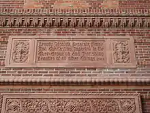 The buildings contains three prominent quotations on its main, west-facing facade. Above the door, there is a quotation from Proverbs, near the south end of the facade there is a passage from Plato, and on the north part a quotation from Lao Tzu.[12]