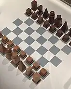 The design of each piece combines two different forms of representation. First, they abstract the visual appearances of traditional chess pieces into simple geometric shapes. Second, the shape of each piece reflects how it moves: pawns and rooks move in straight lines and are represented as rectangular prisms, the bishops feature diagonal lines, the king has both straight and diagonal elements, and the knights are L-shaped.[4][5]