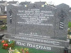 Joseph Edward "Joe" MacManus (often incorrectly spelt Joe McManus) (Irish Seosamh Mac Mághnais; 23 May 1970 – 5 February 1992), was a volunteer in the Sligo Brigade of the Provisional Irish Republican Army. He was killed during a shoot-out after his unit attempted a killing in Mulleek near Belleek, County Fermanagh, Northern Ireland.[4]
