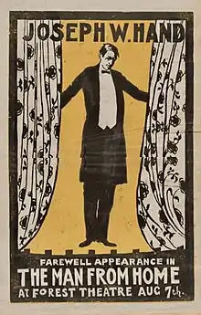 On August 7, 1915, at age 70, Hand had his "farewell" appearance and leading part in the play ‘’The Man From Home,’’ written by Harry Leon Wilson and Booth Tarkington, that appeared at the Forest Theater and was produced by Glenn Hughes for the Carmel Arts and Crafts Club. Wilson helped supervise the play and was in the audience on the night of the opening. Characters in the play included Hand as Daniel Voorhees Pike, John Selby as Hanna; Katherine Wood as Ethel Granger Simpson; and J. Edward Pawson as the Hon. Almerce St. Aubyn.[13][2][1][14][9]: p131