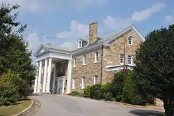 The former Daniels House was named Wakestone by Josephus' wife, Addie Worth Bagley Daniels.[4] It stands in a residential area north of downtown Raleigh, on a 3-acre (1.2 ha) landscaped parcel bounded on the east by Glenwood Avenue (United States Route 70), on the south by Wade Avenue, and on the west by Caswell Street, where the main drive enters the property. The property is separated from other residential properties to the north by a hedgerow. The house is oriented facing west, with a curving drive providing access to parking areas to the west and south (formerly the sites of gardens kept by the Danielses). The house is a 2+1⁄2-story stone structure, roughly U-shaped, with a rectangular main block and two wings extending eastward to the rear. The area between the two rear wings has been filled in and extended further east with a large meeting space added by the Masons in the 1950s. This addition is built of similar stone to the main house, and does not detract from the view of the house as seen from the front.[1]