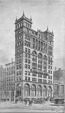 When completed, it seated 3,700 people and was the largest opera house in the world.[20][5]: 18 Its four-story façade had matching seven-story towers with commercial establishments on the ground level, restaurants and ballrooms above, and apartments for bachelors in the upper levels—making this "an early and excellent example of a multi-use project."[20][5]: 17–18 Its plans were published in The American Architect, February 16, 1884.[21]
