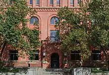 Designed by Cady, the Romanesque style Othniel C. Marsh House was built from 1875 to 1880 in New Haven.[19][52] At the time, this "fortress-like mansion" was quite different from the Queen Anne style that was popular in New Haven.[19][52] It is built of rough-cut red sandstone that is, perhaps, Cady's nod to Marsh's profession as the first professor of paleontology in the United States, with a stick-style wooden tower.[19] The interior, which was finished three years after the exterior, featured dark, heavy woodwork and carved and polished fireplaces.[52] The first floor featured The Wigwam, an octagonal room to showcase Marsh's collections.[52] Marsh bequeathed the house to Yale University in 1899.[19] It is now called Marsh Hall and contains classrooms and offices for the School of Forestry and Environmental Studies.[19]