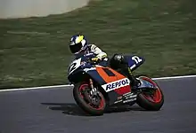 Born on 12 April 1965 in Lugo, Galicia, Spain, Juan Manuel López Mella started his racing career with motocross but by the age of 18 had moved to racing on asphalt. After debuting nationally in the Criterium Solo Moto in 1985, and coming second overall in the junior category of the 250 cc class that year, he then progressed to racing in the World Motorcycle Championships in 1987.[1][2] He became the first Galacian to compete in a world championship. After a season riding a Yamaha TZ250, during which he scored no points, he moved to a Honda RS250R in 1988; once again he finished outside the championship rankings. At that stage, he decided to move to larger bikes.[2]