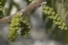Juglans microcarpa, known also as the little walnut,[2] Texas walnut, Texas black walnut or little black walnut (as it belongs to the "black walnuts" section Juglans sect. Rhysocaryon), is a large shrub or small tree (10–30 ft tall) which grows wild along streams and ravines in Texas, New Mexico, Oklahoma, and Kansas, and the northernmost states of Mexico.[1][2] It produces nuts with a width of 1/2—3/4 in. The pinnately compound leaves bear 7—25 untoothed to finely-toothed leaflets, each 1/4—1/2 in wide. It is found at elevations ranging from 700 ft to 6700 ft.[3]