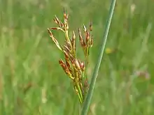 The form of the flower differentiates rushes from grasses or sedges. The flowers of Juncus comprise five whorls of floral parts: three sepals, three petals (or, taken together, six tepals), two to six stamens (in two whorls) and a stigma with three lobes.[3] The stems are round in cross-section, unlike those of sedges,[3] which are typically somewhat triangular in cross-section.[5]