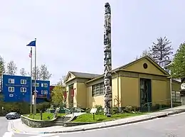 The Juneau-Douglas City Museum is located at the corner of 4th and Main, opposite the Alaska State Capitol in Juneau, Alaska. It occupies a building which was built in 1950–51 to house the Juneau Memorial Library. It is a two-story Classical Revival structure built out of concrete with red marble trim elements. A gable-roofed projecting section at the center of the long wall provides the main entrance, which is recessed in an opening the full height to the pediment. This projecting section is flanked by banks of five metal-framed awning windows. The northeast facade has a gable pediment similar to that of the entry projection, below which is a large rectangular window, behind which a stained glass decoration has been installed. The building served the city as its library until the 1980s, at which time it was repurposed to house the city museum.[2]