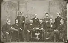 Committee of the Lithuanian Scientific Society, c. 1911. Sitting, from left: Juozas Kairiūkštis, Antanas Smetona, Augustas Niemi, Jonas Basanavičius, Antanas Vileišis and Jonas Vileišis. Standing, from left: Juozas Balčikonis, Zigmas Žemaitis, Mykolas Biržiška and Jurgis Šlapelis.