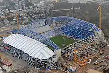 Modernization and expansion project of the stadium was delivered by Modern Construction Systems. In comparison to the earlier architectural concepts, the last one changed the roof construction design. The concept introduced roof as a membrane in natural colors of silk. The whole membrane is divided into equal segments – each of them is 9 meters long and gives the impression of wavy-like shape. The roof forms a cohesive whole over stands I, II, and III. Part of the roof over the stand no. II is a movable structure, designed to ensure proper illumination of grass on some part of the pitch. Cubature of the stadium is 1,300,000 m² and total area is 250,000 m². The original architectural concept of stadium modernization from 2002, was finally replaced by concept designed in 2008. Construction work based on this concept took place in years 2008–2012.
