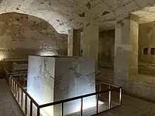 The burial chamber, located at the end of 160 metres of corridor, originally held a set of four nested sarcophagi. The outer one of these was so voluminous that parts of the corridor had to have their doorjambs demolished and rebuilt to allow it to be brought in. These jambs were then rebuilt with the help of inscribed sandstone blocks which were then fixed into place with dovetail cramps.