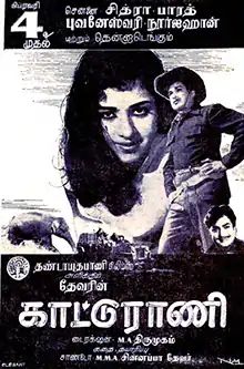 Kaattu Rani (transl. The queen of the jungle) is a 1965 Indian Tamil-language film produced by Sandow M. M. A. Chinnappa Thevar via Dhandayuthapani Films and directed by M. A. Thirumugam. The film stars S. A. Ashokan, K. Balaji, K. R. Vijaya and Sheela. It was released on 4 February 1965.
