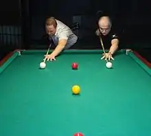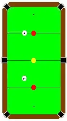 The players lag to decide who will be the first shooter; the player who wins the lag begins the game.[5]: 0:01–0:46 The object balls are positioned at their spots, and the cue ball of the winner of the lag is placed behind the head string, while the lag-loser's cue ball is placed somewhere between the foot (top) string and center string,[5]: 0:01–0:40 but cannot obstruct the first player being able to shoot the yellow kaisa toward the corner pocket diagonally opposite the corner pocket closest to the first player's cue ball. At the start of the game (or with ball-in-hand after an opponent's foul), the player cannot shoot an object ball directly to a side (centre) pocket., though this shot is legal at any other time.