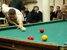 Kaisa or karoliina is a cue sport mainly played in Finland. The game originated in Russia, where it is still played to some extent. Kaisa equipment is similar to Russian pyramid from the 68 mm (2+11⁄16 in) balls, small pockets barely large enough for a ball to enter, and the long and heavy cue sticks. Kaisa tables are usually 10 feet long, and thus 2 feet shorter than official tournament Russian pyramid tables, which are 12 feet long. It is a two-player or two-team game. As with many carom billiards games, both players have their own cue balls used to shoot at the other balls, and usually differentiated by one cue ball having a dot or other marking on it. In all, five balls are used: the yellow object ball (called the kaisa in Finnish), two red object balls, and the two white cue balls (each of which serves as an object ball for the opponent). The game is played to 60 points, in a rather elaborate scoring system, reminiscent of those used in snooker and English billiards, with points being awarded for various types of shots. Like both Russian and English billiards, which are also played on large pocket billiards tables, kaisa is a hybrid of carom and pocket billiards game styles. Kaisa is principally a recreational game, without professional players. However, the first kaisa world championship tournament was held in April 2010. Participants came from 33 countries, and the main tournament was held in Kotka. A Finnish player, Marko Rautiainen, won the championship title.