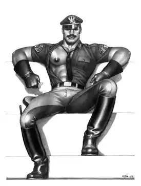 Laaksonen began drawing multi-panel stories in 1946 as personal projects and as gifts for friends,[4] and drew artwork featuring leathermen as early as the 1950s.[5] He did not submit his comics for publication until the 1960s; his first published comic The Tattooed Sailor was published in the August 1961 issue of Physique Pictorial, a magazine that was the first outlet to publish his illustrations in 1957.[2] Laaksonen's early published illustrations and comics were typically suggestively homoerotic rather than explicitly pornographic, though as censorship laws began to relax towards the end of the 1960s, he began to depict more overtly sexual material in his work.[6] These early comics were one-shots (single stand-alone stories), but by 1965 Laaksonen had begun to experiment with recurring characters: first a character named Mike[lower-alpha 1] and later a Tarzan-inspired character named Jack.[2]