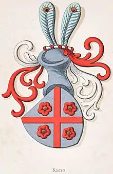 The coat of arms of the Kane-family had a white background, and a red saltire with four red roses (or sometimes stars) in each of the four free spaces. On the helmet it had two feathers of a peacock.[1]
