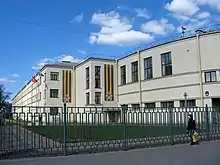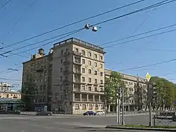 In 1930s a long three-storey school building was erected at the eastern end of the street on the corner of Antonovskiy Lane, now Kharchenko Street. It was built to an individual project by Vladimir Munz in Constructivist style for a young cadets school.[34] It features a large auditorium in its from semicircular part, two gyms at the back, and during the 2000s refurbishment its sports grounds were turned into a soccer and track and field stadium. After World War II school staff and students met veterans of Soviet guerilla units operating during the war in the then-larger city's region Leningrad Oblast, now in Pskov Oblast. Its rural area cut off from the besieged Leningrad by enemy German lines was controlled by the Soviet guerrilla troops and managed to collect and deliver to the starving city a food supply train of horse-drawn sleighs in the harsh winter of 1941-42. The school has its museum of these events and regional 2nd guerilla brigade. The school and the street were awarded the name of Mikhail Kharchenko, the Soviet officer in charge of the delivery operation guard. It was a girls' school until the mid-1950s. It gives full elementary and secondary education.