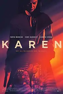 Karen is a 2021 American crime-thriller film written and directed by Coke Daniels, and starring Taryn Manning, Cory Hardrict, Jasmine Burke, Roger Dorman, Brandon Sklenar, and Gregory Alan Williams.[1][2][3][4] The title of the film is a reference to the American "Karen" stereotype.[5] The film was critically panned upon release.
