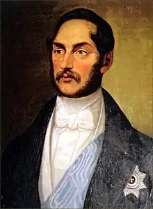 During the Schleswig–Holstein question, Duke Charles was a supporter of the Schleswig–Holstein movement. In 1846, as head of the House of Glücksburg, he protested against King Christian VIII's open letter on the succession in the duchies of Schleswig and Holstein, and out of dissatisfaction resigned from the Army in August of the same year.[5] Nevertheless, eight days after his accession to the throne, King Frederick VII gave him the rank of major general.[6] Duke Karl actively sided against Denmark during the First Schleswig War from 1848 to 1851, which caused the ducal couple's relations with the Danish Royal family to be severed. During the war, he initially took command of one of the provisional Schleswig-Holstein government's Infantry Brigades, but already in the fall of 1848, he and his wife moved to Dresden in the Kingdom of Saxony.[5] There they resided until 1852, when they returned to Denmark after am uneasy reconciliation was established.[6] As a result of his rebellion against the Danish government, Duke Carl lost his Danish orders and decorations and only had them restored in 1856.[5] Also, in 1854, he had to cede the family seat Glücksburg Castle to King Frederick VII of Denmark who used the castle as his summer residence and also died there in 1863.[7]