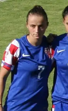 Katarina Kolar is a Croatian football striker currently playing for BV Cloppenburg in the 2. Bundesliga and the Croatian national team.[1] She has also played for ŽNK Osijek and Plamen Križevci in Croatia and Austria Kärnten in the Austrian Frauenliga.[2]