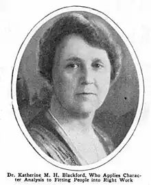 Katherine M. H. Blackford (born 18 Mar 1875, Kansas as Katherine Melvina Huntsinger; died 11 Sep 1958, San Diego), was an American pioneering writer on human resources. She also wrote books on "character analysis", which went into many editions.