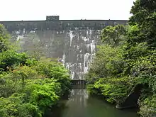 Kawachi Dam is a dam in Yahata Higashi, KitaKyushu City, Fukuoka Prefecture, Japan.[1] It was built from stone and mortar[2] to sustain water flow for local steel mills[3] between 1919 and 1927. It was once referred to as the "Orient's best dam". As for Minamikawachi Bridge, completed in 2006,[4] it is a part of Kitakyushu Seminational Park and has been a national industrial heritage since 2007. A mountain hike begins from these sites. Minami-Kawachi bridge on the reservoir (33°50′17″N 130°48′38″E / 33.838083°N 130.810667°E) was classified as Japanese Important Cultural Property in 2006.