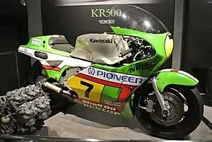 The Kawasaki KR500 was a racing motorcycle manufactured by Kawasaki from 1980 to 1982 for competition in the Grand Prix motorcycle racing series. The motorcycle was powered by a 494 cc two stroke engine, and used an aluminium monocoque frame, similar to the 1979 Honda NR500 racer, aimed at improving aerodynamics with a small frontal area, improving chassis stiffness and reducing weight.[1]