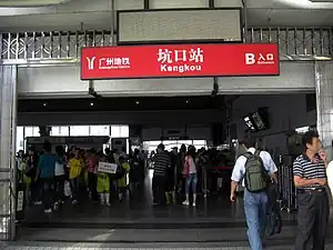 Kengkou Station (Chinese: 坑口站; Jyutping: haang1hau2 zaam6; Cantonese Yale: Hāangháu Jaahm) is a station of Line 1 of the Guangzhou Metro. It started operations on 28 June 1997. It was located at the ground level of the junction of Huadi Avenue Middle [1] and Longxi Avenue [2] in Fangcun, Liwan District. It is adjacent to Fangcun Coach Station (Chinese: 芳村客运站), the transportation hub for the western area of the Pearl River Delta.[3][4]