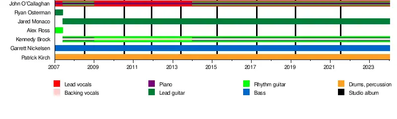 The Maine is an American rock band from Tempe, Arizona. Formed in 2007, the group consists of lead vocalist, guitarist and pianist John O'Callaghan, lead guitarist Jared Monaco, bass guitarist Garrett Nickelsen, drummer Patrick Kirch, and rhythm guitarist Kennedy Brock.[1] The band is joined by touring member Adam Simons, as of 2018, who plays keys, rhythm and lead guitar as well as percussion.