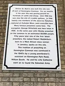 In the 1730s, Methodists John Wesley and George Whitefield preached to thousands on Kennington Common. In 1746 the Surrey County Gallows at the southern end of the Common was used for the execution of nine leaders of the Jacobite rebellion of 1745. The Common was also where the Chartists gathered for their biggest demonstration in 1848. "The Gymnastic Society" met regularly at Kennington Common during the second half of the eighteenth century to play football.[18] The Society – sometimes claimed to be the world's first football club – consisted of London-based natives of Cumberland and Westmorland.