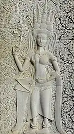 Sampot Tep Apsara (Khmer: សំពត់ទេពអប្សរា) is a type of sampot from the Khmer Empire era associated with courtly Apsaras. Its depiction can still be seen on the bas-reliefs of Angkor Wat.[5] Generally, the sampot tep apsara is both knotted at the waist and secured with a belt. Long pleats are gathered at the front, running the full length to the wearer's ankles.