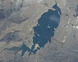 The lake is connected to Khoton Lake by a wide and short channel (about 2 km (1 mi)); both, together with the Dayan Lake, feed the Khovd River.[1] Khurgan Lake is located within the Altai Tavan Bogd National Park.[2]