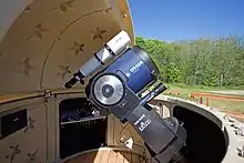 A 10" Meade 2120 LX3 on a fork mount within a SkyShed POD system was opened to the public on July 17, 2010.[1][2] At the time, the observatory was the first public use observatory in any provincial park.[3] This setup provided excellent views but limited automation. In 2011, the telescope mount was upgraded to a Losmandy G11 Gemini 2 automated system, donated by Bill and the Gardner family. This upgrade significantly improved the usability of the telescope for staff and Park visitors alike. The observatory sits upon a deck with two ramps (to ease the movement of people) donated by the Friends of Killarney Park.