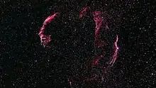 ![]() The Veil Nebula (NGC 6960, NGC 6992 and NGC 6995) as imaged with a 61mm telescope in the Kchi Waasa Debaabing Dome at the Killarney Provincial Park Observatory Complex |