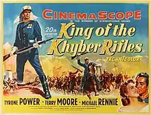 King of the Khyber Rifles is a 1953 adventure film directed by Henry King and starring Tyrone Power and Terry Moore. The film shares its title but little else with the novel King of the Khyber Rifles (1916) by Talbot Mundy. This novel was also the basis for John Ford's The Black Watch (1929). The Khyber Pass scenes were shot in the Alabama Hills, Lone Pine, California. Released by 20th Century Fox, the film was one of the first shot in Technicolor CinemaScope.