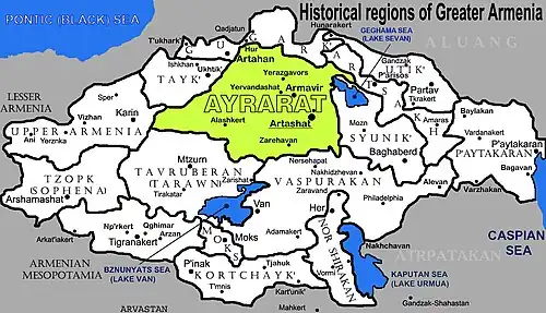 Armenia, also the Kingdom of Greater Armenia,[4] or simply Greater Armenia or Armenia Major (Armenian: Մեծ Հայք Mets Hayk;[5] Latin: Armenia Maior) sometimes referred to as the Armenian Empire, was a kingdom in the Ancient Near East which existed from 331 BC to 428 AD. Its history is divided into the successive reigns of three royal dynasties: Orontid (331 BC–200 BC),[6][7] Artaxiad (189 BC–12 AD)[8][9][10] and Arsacid (52–428).[11]