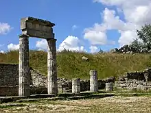 There are no known coins from the Bosporan Kingdom after the last ones minted by Rhescuporis VI in 341, which makes constructing a chronology very difficult. Though the kingdom is traditionally believed to have been destroyed at the end of his reign by the Goths and the Huns,[19] there is no concrete evidence for this.[20] There is an inscription by a Bosporan ruler named Douptounos from c. 483, nearly a century and a half after Rhescuporis VI, which makes it unlikely that the kingdom and its line of kings came to an end in the mid-4th century. Additionally, archaeological data from the time indicate a period with a growing economy rather than societal collapse.[20]